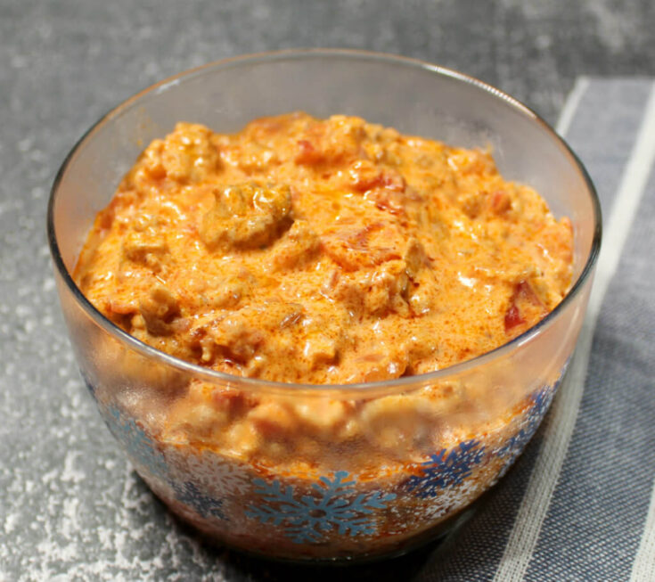 This is an amazingly creamy and flavorful dip. I made this for our Christmas feast and my entire family loved it! If you don’t tell them, no one will guess that this delicious dip comes together so quickly and easily with just a few simple ingredients. Along with our meats, we combine cream cheese, Ro-Tel diced tomatoes and green chilies, and smoked paprika. Yep, that’s it! I like to quickly cube my cream cheese when adding it to the crockpot so it will melt quicker and evenly into the dip. For the Ro-Tel, I used the original, which has a little kick to it, but is not overpoweringly hot. If you want a milder dip, you can add mild Ro-Tel, and if you’d prefer a hotter dip, you can use the hot version that Ro-Tel makes.