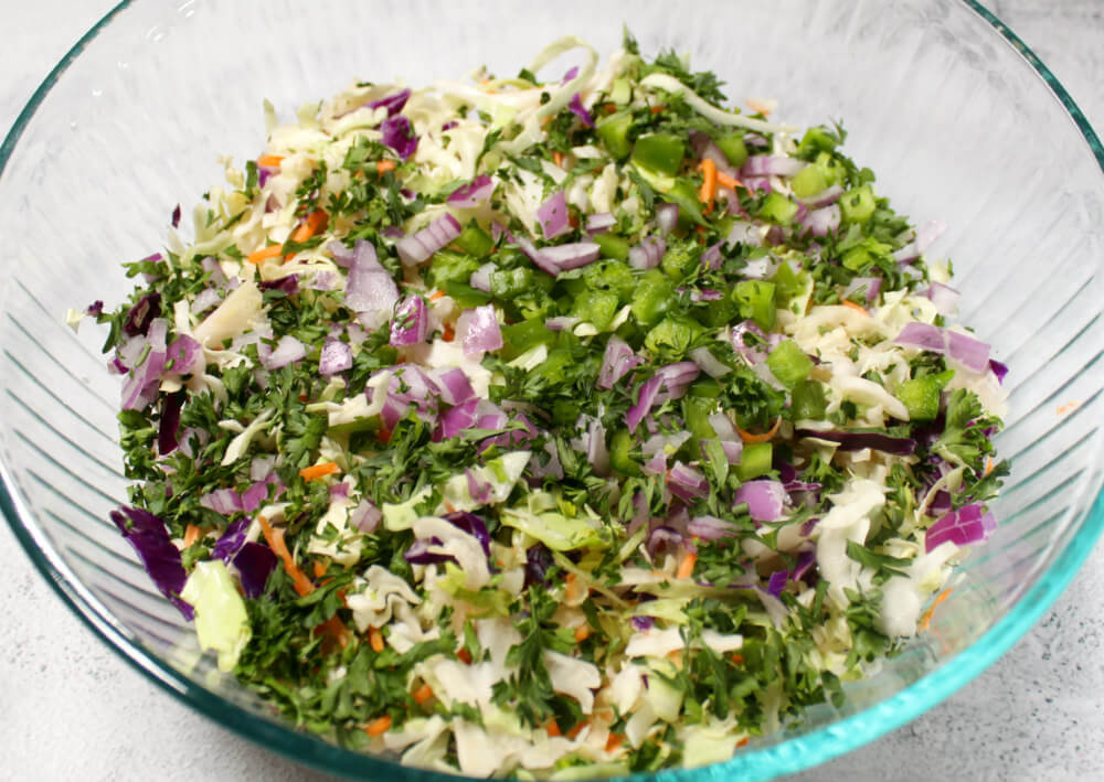 1. In a large mixing bowl, add coleslaw mix. Cut or tear up any large pieces. Add parsley, peppers, and onions. Stir to combine. Set aside.