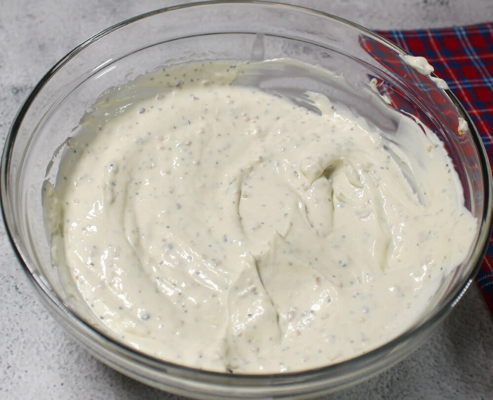 The dressing for this coleslaw is a creamy dressing that’s easy to make, yet amazingly flavorful. We start with a base of keto mayonnaise, sour cream, and heavy whipping cream. When buying mayo, you’ll want to make sure there’s no added sugar or oils that you don’t want. I use the avocado oil mayonnaise from Chosen Foods as my go-to. Everything bagel seasoning is a flavorful and versatile seasoning mix that really makes this coleslaw shine! Although you may see some slight variation in ingredients depending on the brand, the main ingredients in everything bagel seasoning include black and white sesame seeds, minced dried garlic, minced dried onion, poppy seeds, and either salt or sea salt flakes. I added just a touch of keto sugar to my dressing along with some celery seeds and salt. You can give your coleslaw a taste and add more salt if you’d like.
