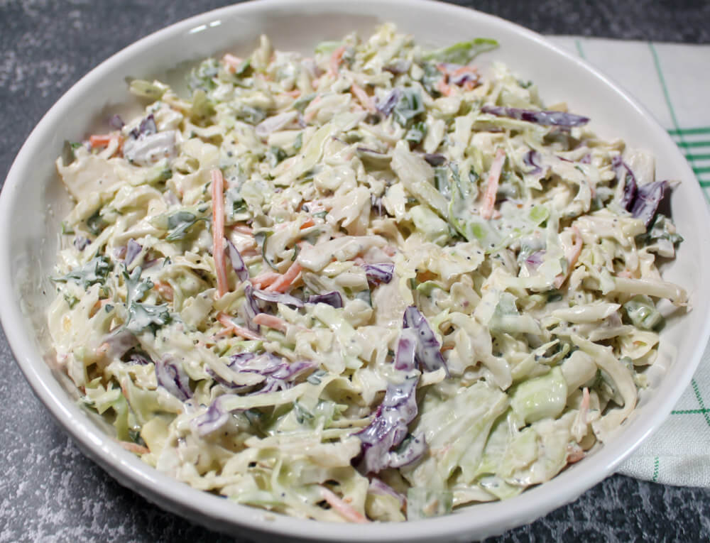 You have some great low carb options for serving this coleslaw! It pairs nicely with any kind of meat including beef, chicken, pork, seafood, and turkey. For some casual options, you can serve this coleslaw as a side for burgers, brats, keto sandwiches, and lettuce wraps. It’s also a great dish to serve with pulled chicken or pulled pork, keto meatloaf, or any grilled meat. This coleslaw can also be served with steaks, roasts, and seafood mains. You can also serve it with most any kind of keto casserole. This salad is a super choice for barbecues, parties, and to bring to potlucks. For a fun change up, you could also pair this coleslaw with a keto soup for a special soup and salad combination meal!