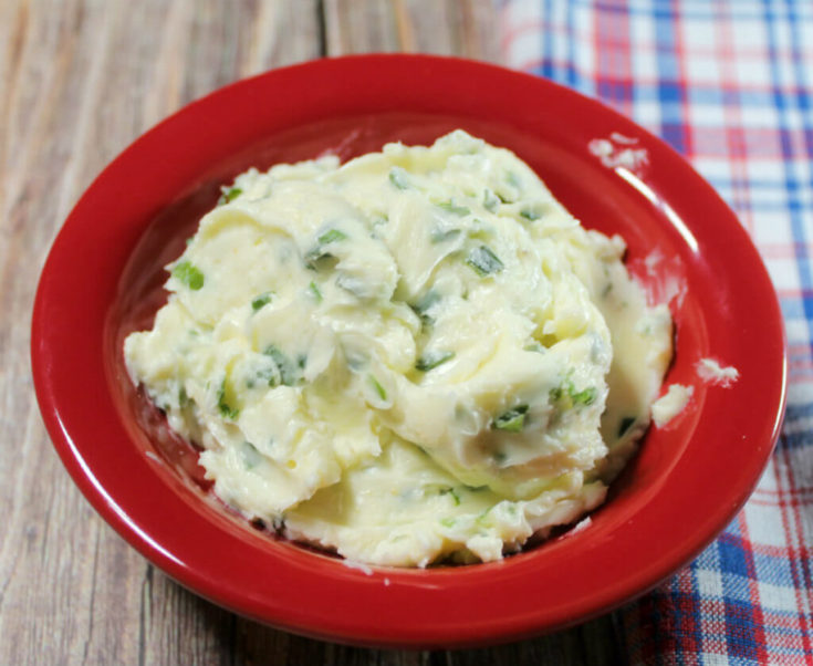 This compound butter is quick and easy to make. You’ll want to start with softened butter to help ensure all ingredients will be evenly distributed throughout the butter. You have a couple great options for making this compound butter. You can add all your ingredients to a mixing bowl and use an electric mixer to beat all ingredients together. Alternately, you can use a soft spatula to stir ingredients together. You’ll want to mix your ingredients until your chives are evenly distributed in your butter. At this point, you can cover your butter and refrigerate it for an hour or even longer. If you’d like, you can place your butter onto plastic wrap or parchment paper, roll it and shape into a log shape. Once refrigerated, this will allow you to be able to cut it into cute round slices for serving.