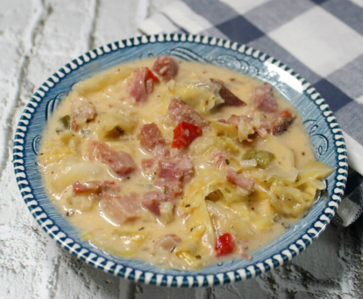 4. Add 3 cups of chopped ham, or enough to equal 4 cups total ham, to stockpot along with riced cauliflower, cabbage, and heavy whipping cream.