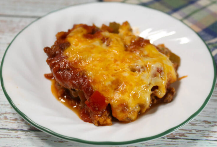 I used a 90% lean ground beef mixture to make this dish. Alternately, you could use a leaner or fattier ground beef mixture for yours. Whichever beef mixture you use, you’ll want to drain the grease well after cooking. If you’d like, you could also substitute with ground pork or Italian sausage to make this dish. You could even use ground chicken for a fun change-up to this casserole. For the bell peppers, I used a combination of green and red bell peppers to make my casserole. I love this flavor and color combination, but you can use any color or color combination of bell peppers to make this dish. For the onion, I used a yellow onion, but a white onion would work great as well. We also add a little salt and pepper when cooking our beef, peppers, and onions.