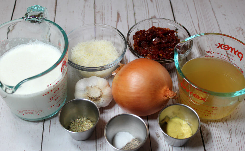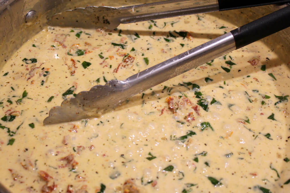 Fresh basil is one of the stars of this dish. It gives the sauce a fresh and vibrant flavor and adds awesome color to the sauce. I used julienne chopped sun-dried tomatoes and cut them in half for my sauce. You can use larger or smaller cut pieces if you’d like. I highly recommend using freshly grated parmesan cheese for this sauce. It melts better and tastes amazing. A little Italian seasoning is all that is needed to create the perfect flavor for this dish. I wanted a thicker sauce, so I added a little xanthan gum. You can omit this ingredient, but your sauce will be a bit thinner if you do.😉