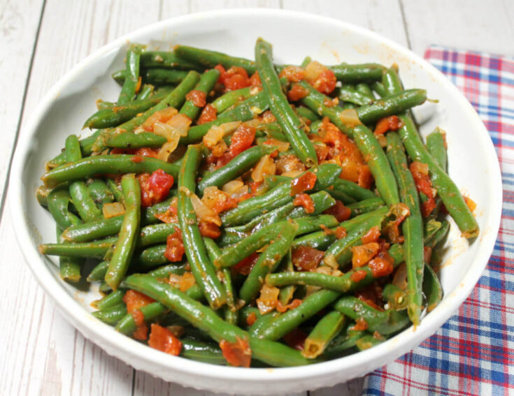 I knew these keto green beans with tomatoes were a winner when my son tried them, then came back for seconds! The combination of green beans, onions, garlic, and tomatoes, with lemon juice and seasoning make this an incredibly delicious dish! These green beans pair perfectly with all kinds of main dishes and are incredibly easy to make. I hope you’ll love this dish as much as we do!