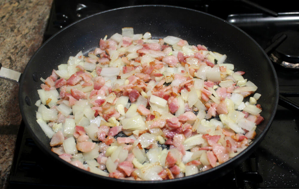 2. Add onions and saute 5 additional minutes, or until bacon reaches desired crispness. Add garlic during last minute.