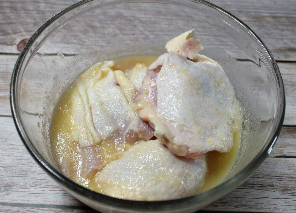 4. Pour vinegar mixture over chicken thighs and gently toss to coat chicken in mixture.